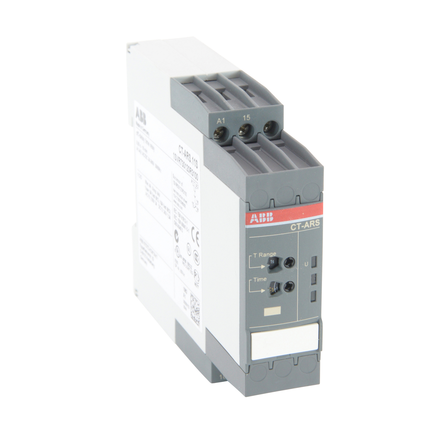 Description: The CT-ARS.11S is a single-function electronic time relay from the CT-S timer range. It provides an OFF-delay (true delay on break) function without auxiliary voltage and with 10 time ranges from 0.05 s to 300 h. This time relay operates with a rated control supply voltage of 24 - 240 V AC / DC and has a 1 c/o (SPDT) output rated at 250 V / 4 A. A sealable transparent cover for protection against unauthorized changes is available as accessory. The device offers screw connection technology with double-chamber cage connection terminals.
