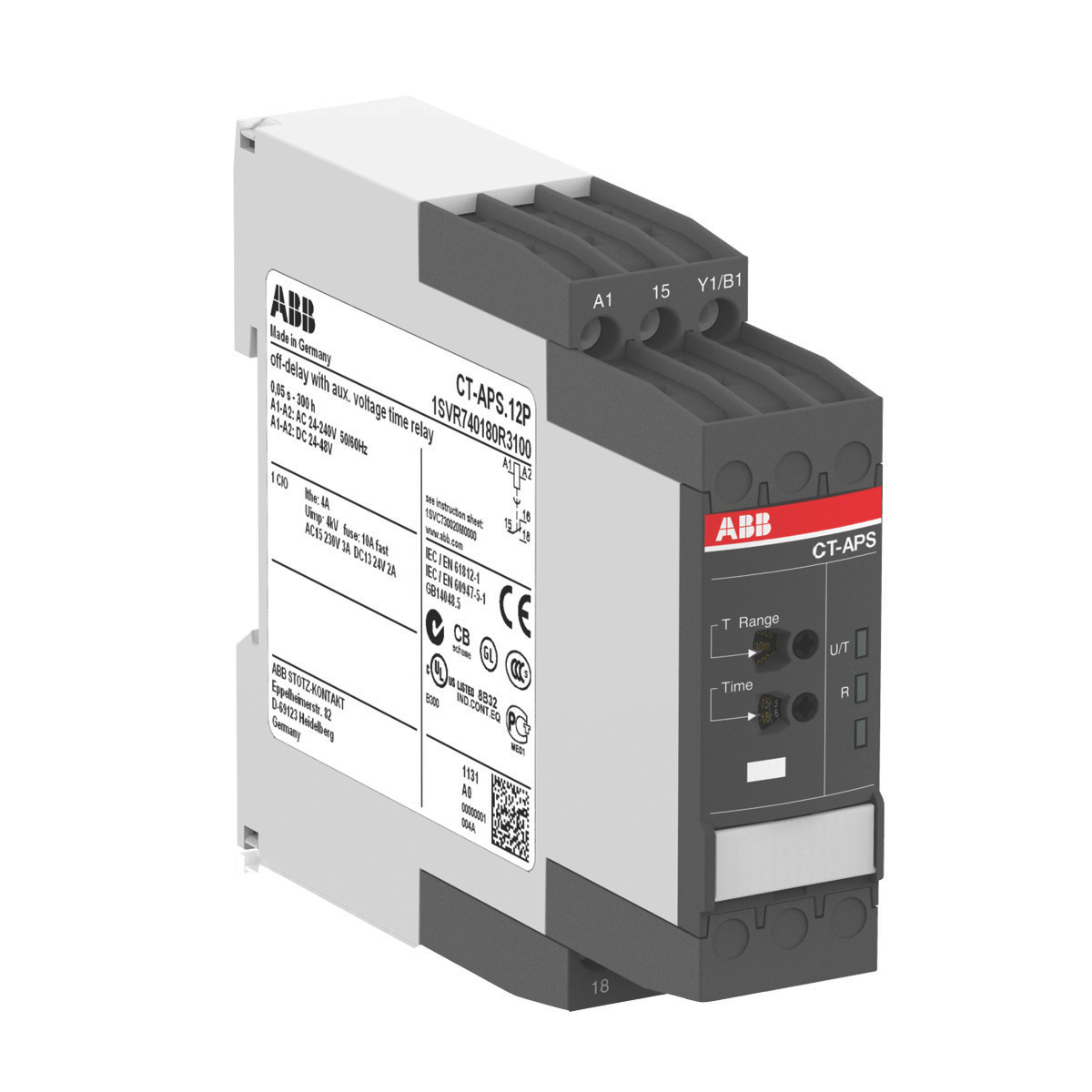 Special Features | The CT-APS.12P is a single-function electronic time relay from the CT-S timer range. It provides an OFF-delay (delay on break) function with 10 time ranges from 0.05 s to 300 h. This time relay operates with a rated control supply voltage of 24 - 48 V DC / 24 - 240 V AC and has a 1 c/o (SPDT) output rated at 250 V / 4 A. A control input works with voltage-related (non-floating) triggering. A sealable transparent cover for protection against unauthorized changes is available as accessory. The device offers maintenance free Easy Connect Technology with push-in terminals. |